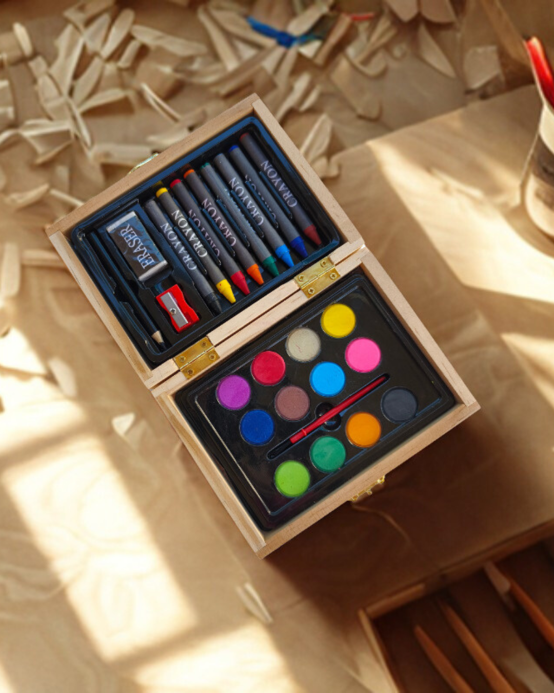 Despierta la creatividad y deja que la imaginación vuele sin límites. Creemos que cada trazo es una aventura, y para acompañar a los artistas de la casa hemos seleccionado este completo set de pintura. Presentado en un precioso estuche de madera natural, este kit reúne todas las herramientas necesarias para transformar una tarde cualquiera en una obra de arte.